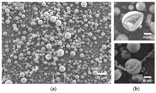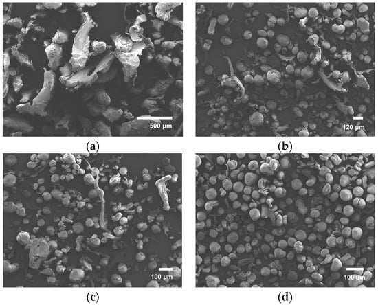 Via a three-step communition process, the pellets are rotor milled to powder form (see Figure 4). First, the pellets are pulverized in the rotor mill using a sieve of mesh size 500 μm to form a coarse powder of very irregular structures with often little to no sphericity (Figure 5a). Structures were found to have dimensions of around 500 μm with some spherical particles of large size (approximately 150 μm) and large thread-like structures. This step was performed primarily to prevent the pellets from plasticizing against the high speed rotating mill. This powder was then further subjected to a refinement step in which the powders were further pulverized to 120 (Figure 5b) and 80 μm (Figure 5c) using sieves of the same mesh size. The final powder was sieved again at 80 μm to clear out the remaining non-spherical structures (Figure 5d). These were then re-fed to the Pulverisette. Subjecting this powder to a refinement step by which the powder was sequentially added to the Fritsch Pulverisette 14 with decreasing sieve sizes resulted in surprising results. A definite improvement in particle morphology was observed. Moreover, particle size progressively approached the aspired range of 45–90 μm with each refinement step. Particle size distributions are noted in Section 3.4.