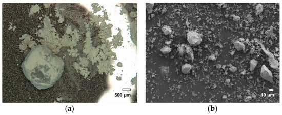After 10 min of ball milling, the PSU pellets had already partly fractionated into a very fine powder (Figure 3a). SEM investigation of this fine powder revealed that it is neither spherical nor of the required size (Figure 3b). Instead, angular structures were apparent, which was to be expected with this technique. Further milling (sampling after every 10 min for 4 h) caused the remaining unfractionated material to pulverize with the same result. Additionally, the powder started to discolor with every fractionation step, suggesting degradation. It is widely known that ball milling is prone to induce degradation in polymeric material [11,27]. This will be further discussed in the section regarding the DSC and GPC results.