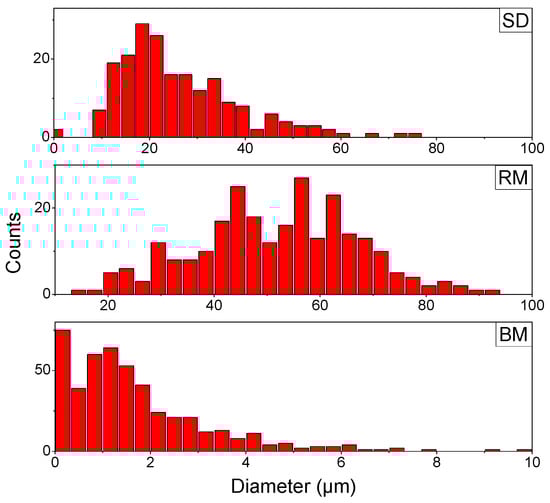 Particle Size Distribution (PSD) of the different processed samples. Spray-Dried (SD) sample at best parameter settings, Rotor Milled (RM) powder subjected to the three-step refinement process with final sieving step, and Ball Milled (BM) sample after 10 min (fractionated fine powder).