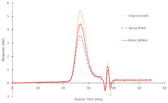 The GPC curves are depicted in Figure 7 with respective molecular weights and polydispersity described in Table 2. No substantial shift in elution peaks is apparent, suggesting no significant degradation phenomena. When looking at the molecular weights calculated from these chromatograms, a slight increase in molecular weight is noticeable for the spray-dried sample. Although this is a very small change (approx. 2% and 3% for weight and number average molecular weight, respectively) this could suggest crosslinking due to degradation. As for the ball milled sample, dissolving the sample material for analysis through GPC seemed to be impossible, pointing towards severe crosslinking through degradation upon ball milling.