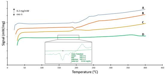 As PSU is an amorphous polymer, we would expect the corresponding curves to be quite flat with the only change in baseline being the glass transition temperature of the polymer itself. The glass transition temperature represents the reversible transition in the amorphous regions within fully amorphous or semi-crystalline materials from a hard and relatively brittle “glassy” state into a molten or rubber-like state as a critical temperature is reached. The thermograms of the first and second heating run on all samples are depicted in Figure 8 and Figure 9, respectively. The DSC measurements show that the different processes have a different effect on the thermal behavior of PSU. The thermogram of virgin PSU (Figure 8C) exhibits a glass transition temperature at 189 °C followed by enthalpic relaxation, which is also expressed in the second heating run (Figure 9C). In the case of high-energy ball milling (Figure 8D), a broad endothermic peak is observed that exhibits a maximum at 359 °C. Furthermore, a glass transition temperature which is almost indistinguishable appears at 196 °C. The inset of Figure 8D depicts this by the change in the second derivative of the baseline. The significant shift in Tg is indicative of a certain degree of degradation occurring during the processing of PSU. The second heating run (Figure 9D) reveals that this broad endothermic peak is lost in the second heating run and might suggest an ordered state due to the processing method. This hypothesis is further tested by XRD measurements on the treated samples in Section 3.7. The second heating run of the ball milled sample also reveals a sternly diminished glass transition, confirming severe degradation. A different trend is found when looking at the rotor milled PSU (Figure 8B). A clear Tg at approximately 189 °C is visible, followed by a slight endothermic peak going from 210 °C to 236 °C. The peak, as was the case with ball milling, disappears upon heating above the endotherm and reappears in the second heating run, suggesting orientation imposed by the processing method onto the polymer chains. However, the Tg remains visible and stable upon the second run, indicating no severe degradation occurring in the process. With spray drying, the PSU was first dissolved, then atomized and dried to form spherical particles. Samples were consequently dried for two days in a vacuum oven at 50 °C in order to remove any residual solvent. A clear Tg is visible at 188 °C with two small endothermic peaks at 237 and 262 °C in the first heating run (Figure 8A). These peaks disappear upon heating above their offset temperature and also suggest a form of orientation imposed on to the polymer chains by the processing method. The second heating curve (Figure 9A) shows a clear Tg again at 189 °C, in accordance with the unprocessed PSU.