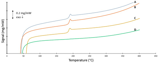 First heating run of DSC measurements on (A) spray-dried powder obtained at best parameter settings; (B) rotor milled powder subjected to the three step refinement process with additional sieving at 80 μm; (C) virgin PSU and (D) fine powder obtained after 10 min of ball milling the PSU pellets.
