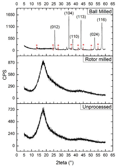 X-ray diffraction measurements were performed to test the hypothesis that the chosen mechanical processing method could impart some orientation into the molecular structure of the material. As PSU is amorphous in its unprocessed forms, we would expect the diffractograms of the treated samples not to show any distinct peaks in the range measured. When looking at the diffractograms represented in Figure 10, the typical broad bands for amorphous polymers without any crystallinity are found. For both rotor milled and unprocessed PSU, this broad band shows a maxima at 1.5°. However, when looking at the ball milled sample, this broad amorphous band has disappeared and instead sharp peaks can be seen at 25.7; 35.3; 37.9; 43.5; 52.7; and 57.6 degrees. These diffractions are representative of the lattice planes (012); (104); (110); (113); (024) and (116) of alumina (of which the ceramic cups of the ball mill are composed [28]), indicative of contamination during milling. However, next to the indexed peaks, smaller diffractions are visible (marked with an asterisk in Figure 10), which are indicative of an ordered structure that is able to reflect the incident X-rays. Finally, the broad amorphous peak which should be present around 17.5° is strongly diminished, again confirming severe degradation. The spray-dried and rotor milled samples did not show any change in their diffractogram from that of the unprocessed PSU; for this reason, only the diffractogram of the rotor milled sample is shown.
