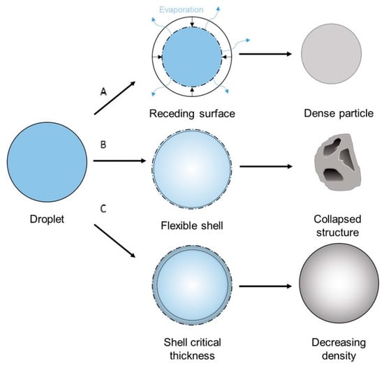 Spray-drying the polymer solution also resulted in microspheres, albeit at smaller particle size: 26.1 μm mean diameter with a standard deviation of 12.8 μm. Further increase of the particle size is possible by increasing nozzle size and drying chamber, which implies upscaling from the Buchi B290 to a larger model, as larger droplet size is required to obtain larger particles [29]. This is not possible with the current setup, yet an ample amount of pilot scale models exist that could meet this demand. Though the main part of the particles consists of microspheres, inconsistencies in the form of collapsed and string like structures were still present on a smaller scale. These inconsistencies can be ascribed to bad jetting behavior caused by too-high solution viscosity in the latter case. The former case can be explained by the low diffusion rate of the polymers. Polymer solutions generally exhibit a large Peclet number, which is related to a low diffusion rate. A low solute diffusion rate can result in skim or shell formation, depending on the parameters used. Vehring et al. [30] described these effects at length through both a numerical and an analytical model. The evaporation model is illustrated in Figure 11. Low molecular weight solutions benefit from a large diffusion rate that allows the solutes to migrate relatively easily inside the droplet. When a droplet is drying, the solvent evaporates at the surface of the droplet, creating a concentration gradient that diminishes to the inside of said droplet. As more solvent evaporates, the surface of the droplet recedes and a saturation occurs, leading to homogeneous precipitation throughout the droplet. This should lead to a dense particle (A in Figure 11). However, when dealing with large molecular weight particles, the diffusion rate is slow compared to the speed of the receding surface, causing a thin shell to be formed. A number of situations may occur; if the evaporation rate is high, a thin shell is formed that is not mechanically stable enough to sustain itself (B in Figure 11). As the solvent evaporates further, the shell will collapse, forming toroid-like or wrinkled structures. On the other hand, if the evaporation rate is high, the shell will attain a critical thickness stable enough to sustain itself (C in Figure 11). In this case, the evaporation continues by migration of the solvent molecules through capillary flow, and precipitation occurs, resulting in a density of the particle that slightly decreases inwards.