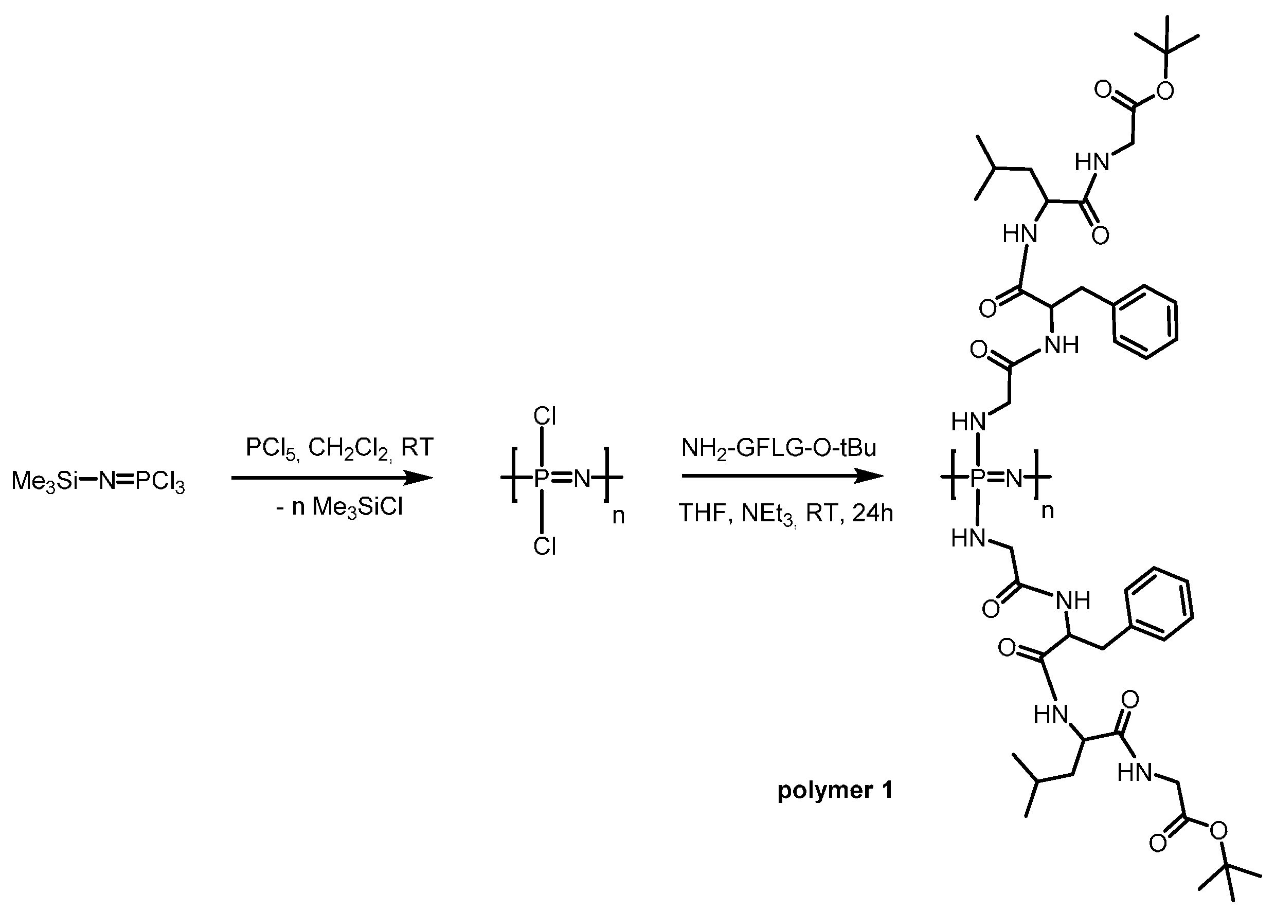 - Teasdale, I.; Wilfert, S.; Nischang, I.; Brüggemann, O. Multifunctional and biodegradable polyphosphazenes for use as macromolecular anti-cancer drug carriers. Polym. Chem. 2011, 2, 828–834. [Google Scholar] [CrossRef]