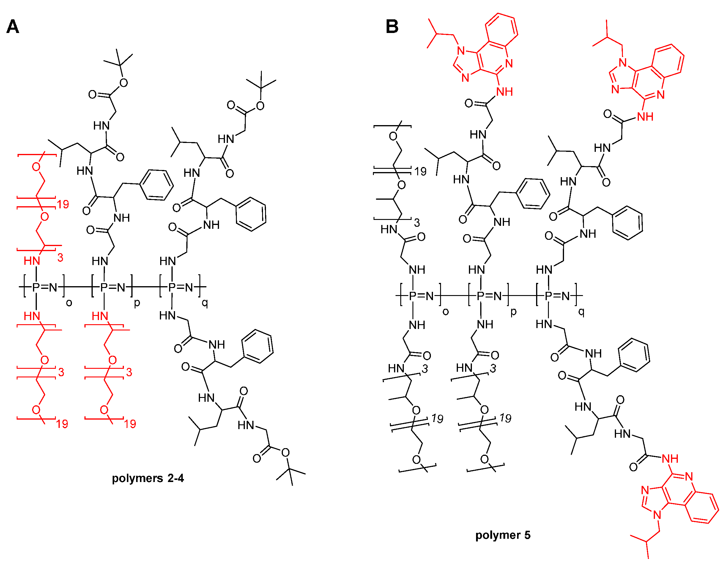 (A) Poly(organo)phosphazenes 2–4 with the tetrapeptide linker GFLG and Jeffamine M-1000 coupled to the polyphosphazene backbone. (B) Poly(organo)phosphazene 5 loaded with imiquimod via the tetrapeptide linker GFLG and Jeffamine M-1000 coupled via a glycine spacer to the polyphosphazene backbone. The combinations of the two different side chains are statistically distributed.