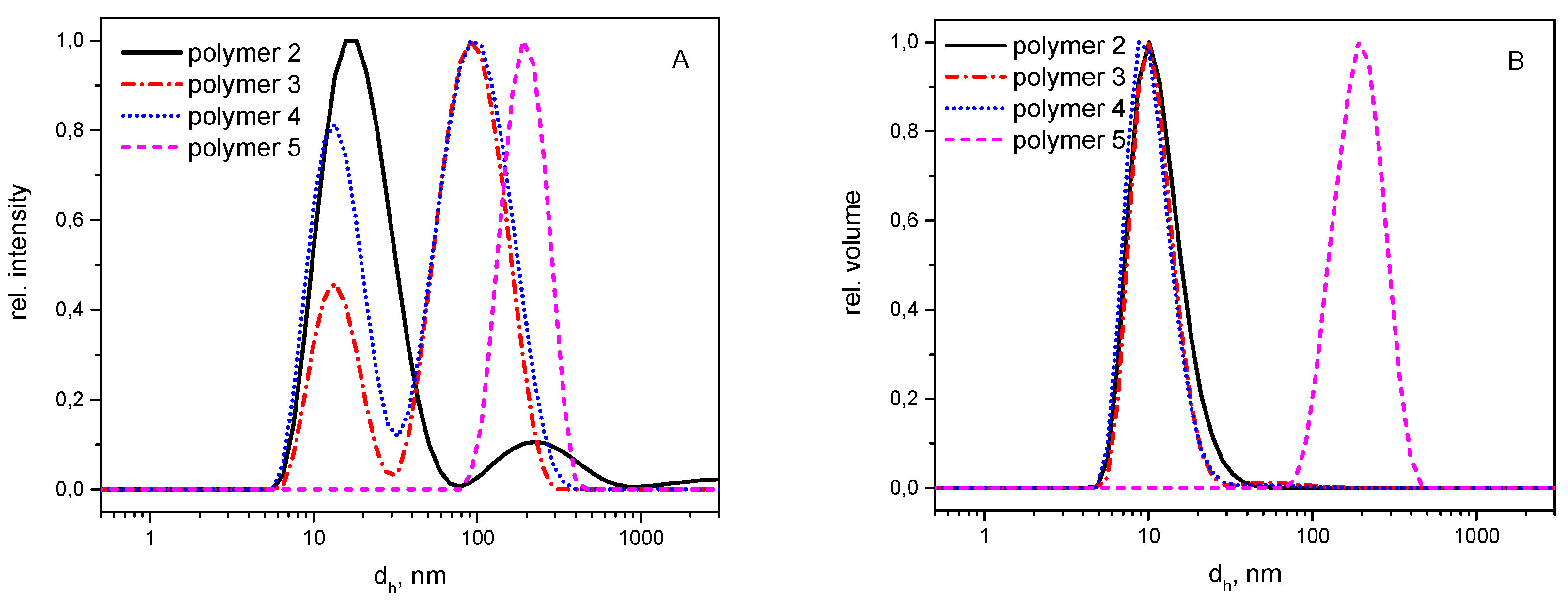 Molecular size distribution by intensity (A) and volume (B) as detected by dynamic light scattering for polymers 2–5 in phosphate buffer at pH 7.4 (polymer concentration 1 mg/mL, dh—hydrodynamic diameter).