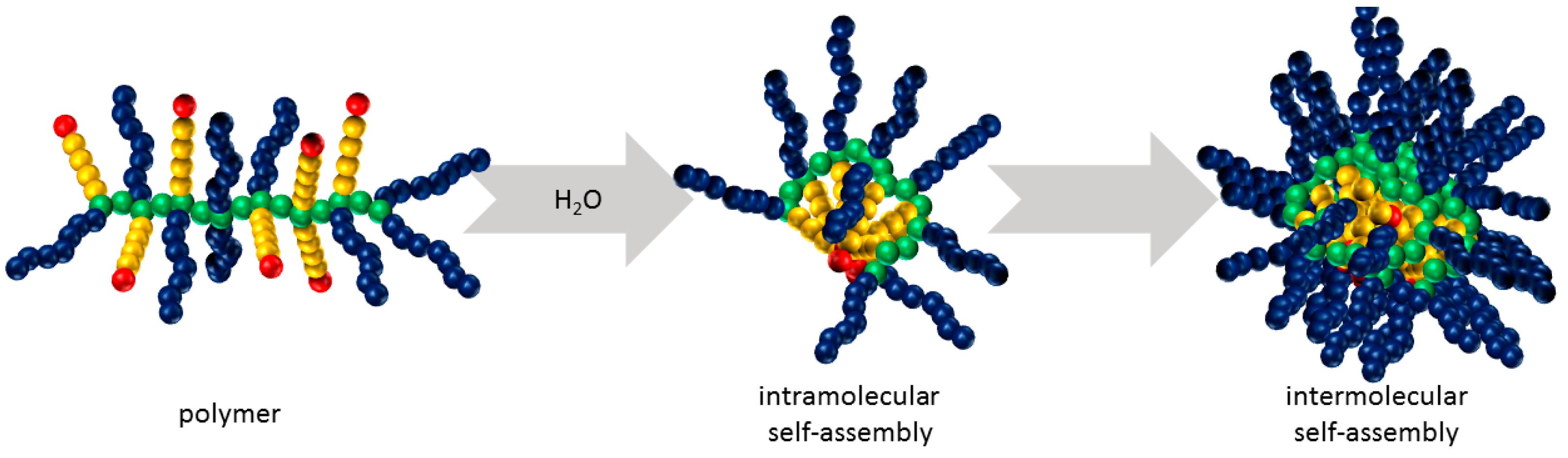 Intra- and intermolecular self-assembly of poly(organo)phosphazenes with amphiphilic character in aqueous solution.