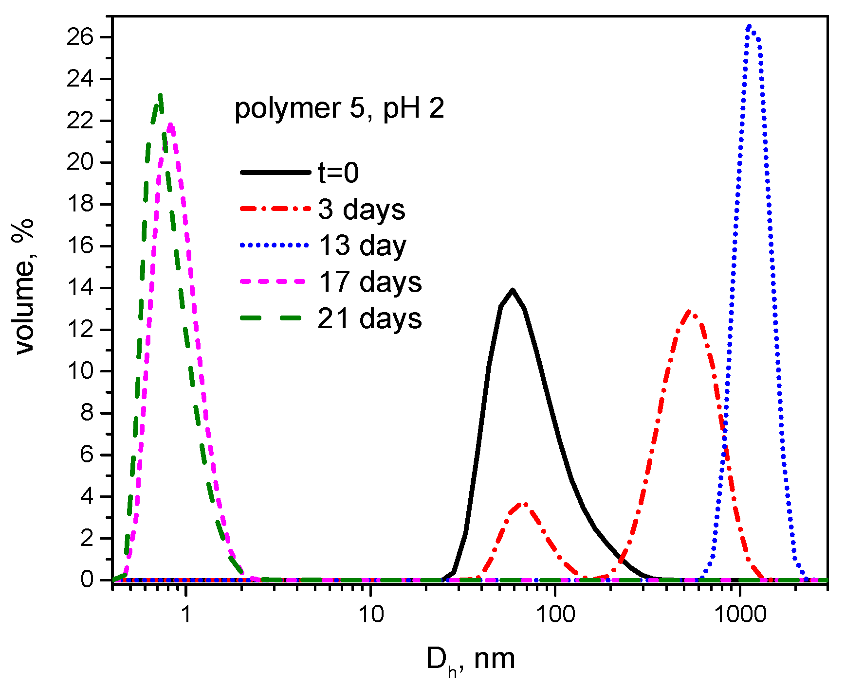 Size distribution by volume measured by dynamic light scattering for polymer 5 in citrate/phosphate buffer at pH 2 at various time points (polymer concentration—1 mg/mL, Dh—hydrodynamic diameter).