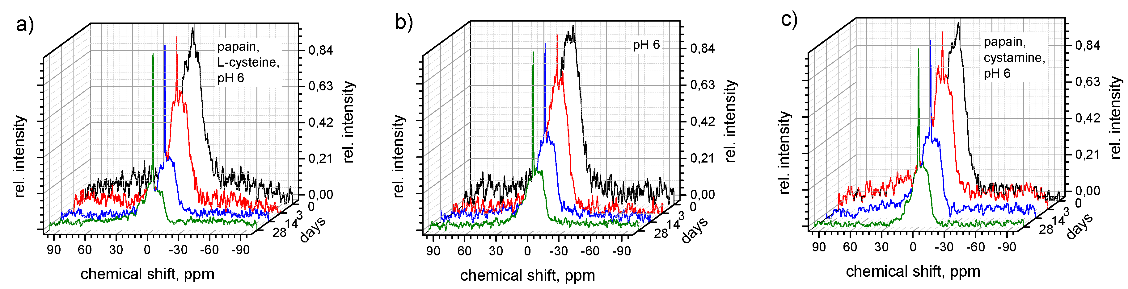 Further to the hydrolytic degradation, the degradation of the hybrid polymers in the presence of the enzyme was also investigated. In these studies, a combination of papain with L-cysteine as an activator was employed to model a phosphate containing cathepsin B—an important lysosomal protease. This allowed using 31P-NMR spectroscopy and photometric determination of phosphates for monitoring degradation products. 31P-NMR spectra for polymer 2 at various degradation time points are shown in Figure 7. A sharp peak at around 0 ppm appeared in all 31P-NMR spectra after one day of incubation and increased over time, whereas the broad signal associated with the polymer decreased. Solutions that did not contain papain displayed a pronounced, but slower hydrolytic degradation under the same conditions (Figure 7b). Similar results were observed in the presence of the papain inhibitor cystamine (Figure 7c). These results appear to suggest the presence of a contribution from enzymatic degradation, as well as the clear hydrolytic response.