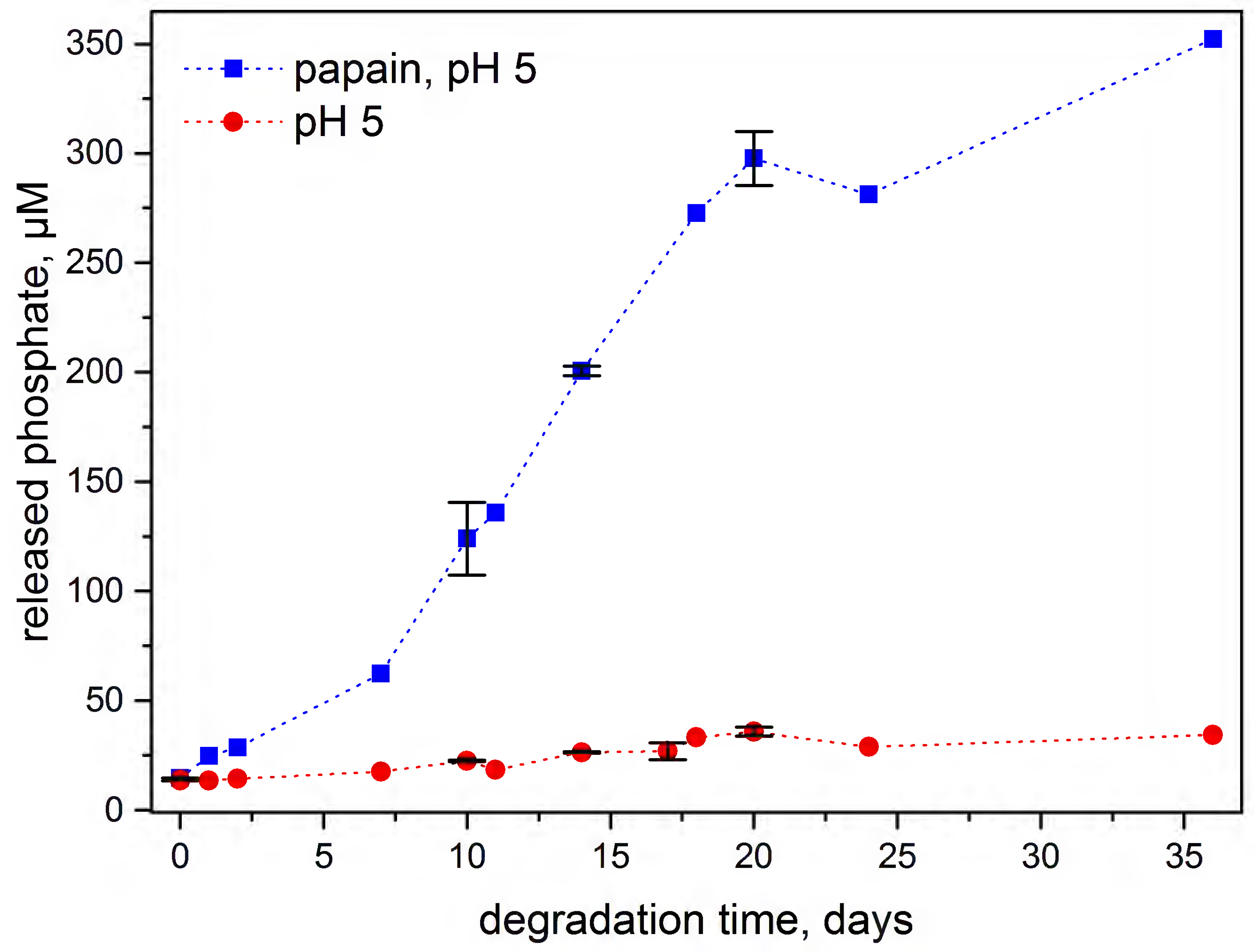 Furthermore, formation of phosphate could also be tracked by photometric molybdate assay [29]. The release of phosphate from polymer 2 was investigated at 37 °C, pH 5 (in acetate buffer due to the incompatibility of citrate buffer for the molybdate assay). Considerably higher degradation rates were observed for the polymer incubated with the l-cysteine activated papain than in its absence, suggesting a significant contribution from enzymatic degradation of the polymer (Figure 8).
