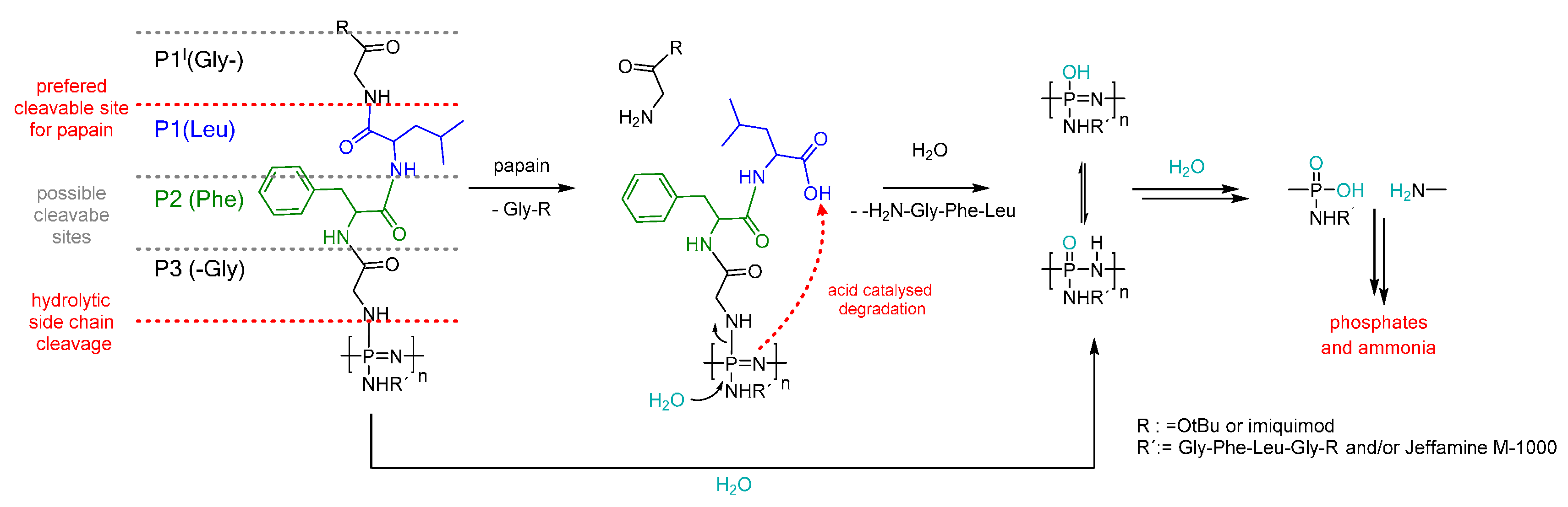 As previously discussed, the hybrid polymers show a hydrolytic labile behavior, due to glycine bound directly to the polyphosphazene backbone, which could be indicated by the 31P NMR spectra as well as photometric phosphate determination. The degradation rate was clearly accelerated by the addition of the enzyme papain, which has similar specificity as the lysosomal enzyme cathepsin B [31,35], suggesting the involvement of an enzymatic degradation route. Papain has the preference for phenylalanine in position P2 (Schechter and Berger nomenclature) of the substrate [38]. Consequently, a cleavage between leucine and glycine-OtBu or glycine-imiquimod is expected (Figure 9). Despite the peptide preferential cleavage site not being directly at the polyphosphazene backbone, the degradation rate was nevertheless observed to be significantly accelerated upon the addition of papain. This observation is explained with an acid-catalyzed mechanism (Figure 9), whereby after enzymatic cleavage of a peptide bond, free carboxyl groups are formed, which would be expected to promote the backbone degradation. This carboxylic acid-catalyzed degradation mechanism has already been proposed for poly(organo)phosphazenes substituted with amino acid esters [44,45]. Moreover, it is to be expected that the entire peptide subsequently disintegrates into its corresponding amino acids in presence of enzymes like papain [16,38], thus leading directly to the hydroxyphosphazene degradation intermediate. Thus, it is proposed that, under lysosomal conditions, two different peptide cleavage mechanisms may occur, both of which would promote backbone degradation.