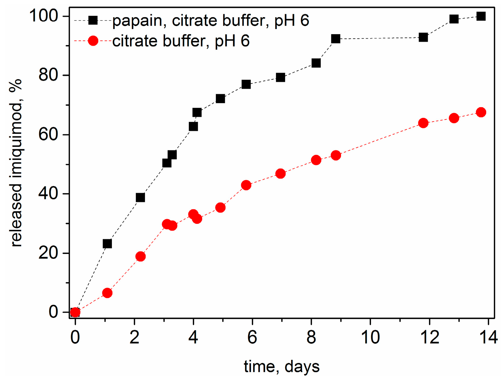 The release of imiquimod from the polymer 5 was analyzed by HPLC and the amount of the released drug was estimated using a calibration curve for the free drug. The samples were stored at 37 °C between each measurement and the investigations were carried out in citrate buffer at pH 6 and with papain in the same buffer system. Within a period of 14 days, 100% release from the polymer–drug conjugate could be observed for the sample exposed to papain and only 65% for the conjugate stored at pH 6 without papain (Figure 10). This observation, suggests that, as expected hydrolytic and enzymatic drug release take place simultaneously. According to the supposed mechanism, Gly-imiquimod is preferentially released by papain but according to other comparable published data from authors using similar GFLG based macromolecular drug delivery systems, Gly-drug degrades eventually to glycine and free drug [16,38]. It is assumed that the bond between glycine and drug is also a secondary cleavage site for papain. If used, as proposed, in polymer therapeutics in vivo, the lysosomal cathepsin B would be expected to preferentially cleave the Gly-imiquimod bond [16,38].