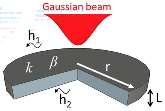 A simple model to obtain the temperature profile across a membrane (thickness well above the mean free path of the energy carriers) is for the case when the composite is considered as a single continuous material, with an effective absorption coefficient β and thermal conductivity k [22]. We therefore assume that β and k include the dependence of the two-components properties of the material such as the CNP network morphology, dispersion size, CNP chemical modification and CNPs-PDMS heat interfacial resistance [8,23,24]. In addition, we also assume that the interrogating distances are greater than the mean inter-particle distance. A mathematical model with such assumptions can thus be set as follows [9]: consider a membrane with thickness L (see Figure 1) having effective β and k parameters and surrounded by dissipating media on both faces (heat transfer coefficients h1 and h2). In such a geometry (radial distances much higher than axial distances, i.e., , ), the increase in temperature can be computed for a time t using Green’s functions in cylindrical coordinates: