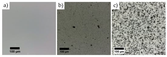 Optical microscopy images of the fabricated membranes: (a) pure PDMS; (b) PDMS+CNP; and (c) PDMS+CNP+CHCl3. The magnification is the same for the three images (the scale bar is shown in (a)).
