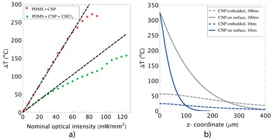 We begin by analyzing the heat generation and transfer features as predicted by the mathematical model obtained in Section 2.1. Figure 4a shows the experimental and theoretical values of ∆T at the point (r = 0, z = L) for the PDMS+CNP and PDMS+CNP+CHCl3 samples. Heat was generated in the membranes by direct irradiation with a 975 nm laser diode coupled to an optical fiber (Corning SMF-28e, Corning, NY, USA, numerical aperture NA = 0.14); the resulting output beam had a Gaussian profile and was located 5.82 mm away from the membranes. The experimental values of ∆T were measured using an IR camera (Fluke Ti300, Everett, WA, USA), while the theoretical values were obtained using Equation (8) and the parameters listed in Table 1.