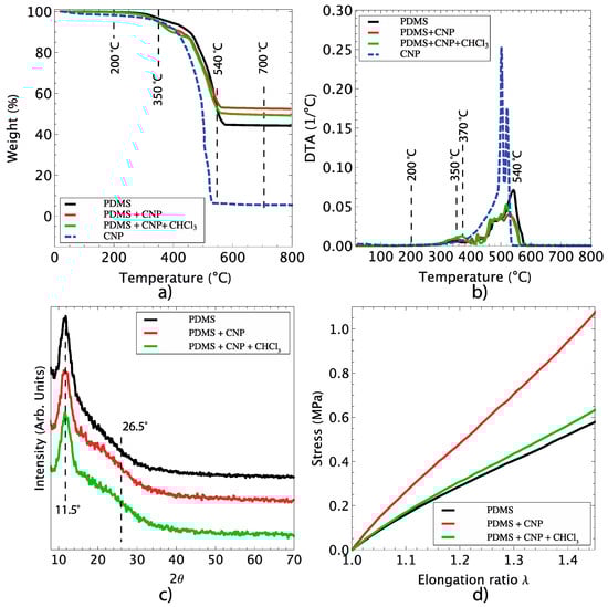 Thermogravimetric analysis (TGA) provides information about the thermal decomposition of the samples as a function of temperature. The TGA results for samples of CNP, pure PDMS and the PDMS/CNP composites are shown in Figure 5a. Clearly, the three polymer-based samples are completely stable from room temperature (25 °C) and up to temperatures just below 200 °C; beyond this temperature, the thermal degradation of pure PDMS occurred at 350 °C. Notice, however, that the CNP start degrading at even lower temperatures. Upon analyzing the first derivatives of the TGA curves, two stages can be identified at which significant weight loss occurs (Figure 5b). The first one is located between 300 and 400 °C and corresponds to PDMS degradation into cyclic oligomers due to Si–O bond scission [28]. The second stage is observed when the PDMS is exposed to higher temperatures (480 and 626 °C) at a slow heating rate; hence, thermal degradation of PDMS starts via depolymerization of the polysiloxane backbone. This leads to the formation of cyclosiloxanes [29], and it has been shown that a radical mechanism occurs throughout the Si–CH3 bond scission yielding methane through hydrogen abstraction [30]. As a consequence, the flexibility of PDMS decreases due to the crosslinking effect of macro-radicals; this, in turn, increases the thermal stability of the sample, and bond reorganization occurs leading to silicon–oxycarbide residues. The thermal degradation of PDMS can be affected by factors such as end-group functionality, impurities or solvent and oxidation. In our case, the addition of a small percentage of CNP (0.1%) slightly reduced the thermal degradation of the composite membranes compared to pristine PDMS samples (around 2%). Notice also that no significant differences are apparent for the thermal degradation of the two composite membranes, occurring between 250 and 300 °C.