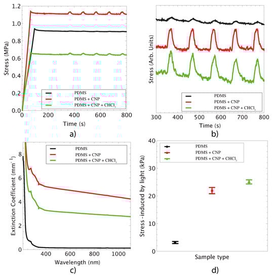 Laser induced mechanical stress in PDMS composites. (a) experimental curves showing the stress relaxation as function of time for PDMS and its composites; (b) peaks evidencing the photo-actuation capabilities of these composites; (c) extinction coefficient as a function of wavelength for PDMS and composites; and (d) photomechanical actuation of PDMS and composites.