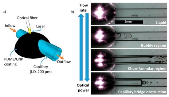 CNP/PDMS coatings for boiling flows: (a) schematic of the basic components to produce a boiling flow using PDMS+CNP coatings; (b) images showing the different flow regimes that can be achieved inside the capillary; the gas-liquid mixture can be varied by adjustments on the flow rate or the optical intensity of the laser diode. The bubbly flow regime constitutes the optimal flow condition since it allows good heat removal and optimal flow conditions. High optical powers or very low flow rates can create gas chambers or capillary bridges than can obstruct or introduce variations in the main flow.