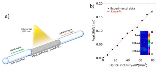 To demonstrate the potential of PDMS/CNP composites for realizing optically tunable fiber devices, a thin film coating (approximately 1.7 µm thick) of the PDMS+CNP+CHCl3 composite was applied on a fiber Bragg Grating (FBG) using the system described in [15]. After curing at 80 °C for 2 h, the coated FBG was irradiated with the 975 nm laser diode focused with a cylindrical lens to obtain uniform illumination over a length of 3 mm (see Figure 8a). The reflection peak of the FBG spectrum was initially centered at a wavelength of 1535.54 nm, and this was monitored with an optical spectrum analyzer as the output power of the laser diode was increased. As shown in Figure 8b, a maximum wavelength shift of approximately 170 pm was registered for the range of optical intensities used in this experiment. Using the typical value for the temperature sensitivity of FBGs (~10 nm/°C [40]), the resulting shift in peak wavelength is equivalent to a local increase in temperature of 16.8 °C. Heating of the FBG when irradiated with the laser was further confirmed with the thermographic camera (see inset in Figure 8b), showing that the temperature is effectively increased only within the illuminated region. Hence, laser tunable FBGs can be attained with the proposed approach offering a novel means for realizing tunable fiber optic filters as an alternative to devices activated by electro-optic effects.