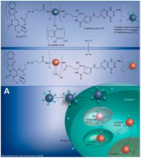 Furthermore, apart from the improved internalization process, charge-reversal NPs composed by polyamidoamine (PAMAM) dendrimer were developed to escort cargo for cascade nuclear and bypass the intracellular drug resistance [98]. Part of primary amines in folic acid (FA) modified PAMAM polymers were amidized with an acid-labile β-carboxylic acid and also partly conjugated with (S)-(+)-camptothecin (CPT), to generate negatively charged FA-PAMAM/CPT conjugates. It could achieve multiple cascade intracellular delivery by following processes: (i) entering in cells via FA receptor-medicated endocytosis; (ii) rupturing the lysosome membrane and escaping into the cytoplasm by means of highly positive charge; and (iii) traversing to nucleus and releasing CPT quickly. On this occasion, this nuclear CPT could bypass the cell membrane-associated and cytosolic drug-resistance mechanisms, which can efficiently enhance its cytotoxicity (Figure 2).