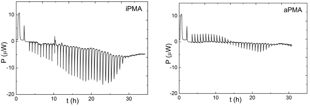 Raw ITC data (power, P, in μW) obtained from injections of 5 μL aliquots of 0.06 M HCl into 2 mL of 0.01 M iPMA (left) or aPMA (right) in 0.01 M aqueous LiCl solutions at 25 °C. The first peak in both thermograms corresponds to static and the second one to dynamic calibration. Subsequent peaks are due to the protonation reaction.