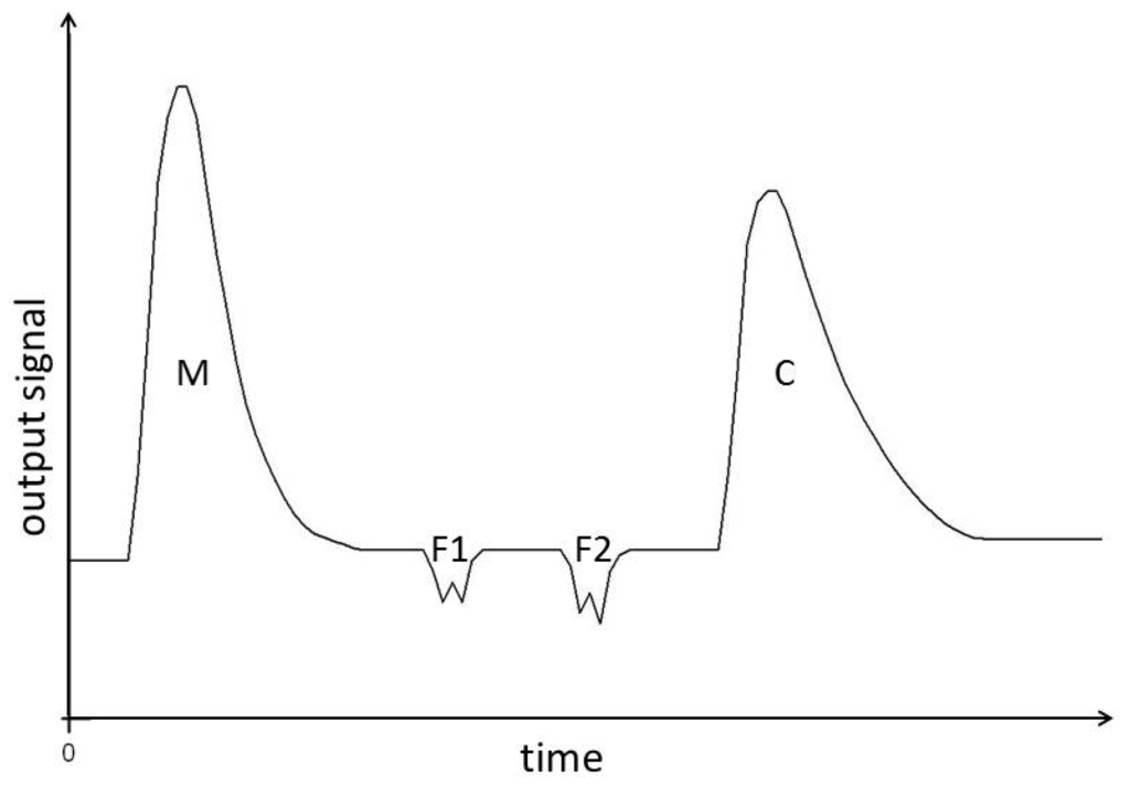Example of an output signal from a batch calorimeter: peak designated by M represents the heat effect due to dilution of aqueous iPMA solution with water by a factor of 2 (T = 25 °C), peak C corresponds to calibration and peaks F1 and F2 are heat effects due to shearing of solutions in the calorimeter (see text).