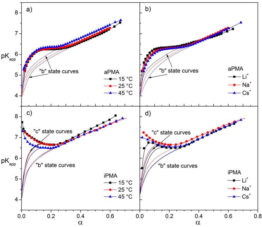 Potentiometric titration curves (pKapp versus α) for aPMA (a,b) and iPMA (c,d); left panel: effect of temperature (T = 15, 25, 45 °C) in 0.01 M NaCl; right panel: effect of counterion in 0.01 M XCls (X = Li, Na, Cs) at 25 °C. Filled symbols (together with the lines) are the experimental data (“a” state curves), dotted lines are the “b” state curves and solid lines are the “c” state or hypothetical curves for iPMA. For details on how the “b” and “c” state curves were obtained see text and Supplementary Materials.