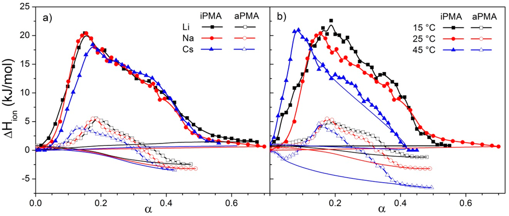 The integration of the peaks in the thermograms measured by ITC resulted in ΔHion values that are plotted in dependence on α in Figure 4a (for different 0.01 M XCls at 25 °C) and 4b (for different temperatures in the presence of 0.01 M NaCl) for both PMAs. Measurements for iPMA were performed for all ions at all three temperatures (these plots are shown in Figure S4, Supplementary Materials). The endothermic peak, which is seen in all curves, is considerably higher and extends over a broader α region (0.05 ≲ α ≲ 0.5) in the iPMA case than in the aPMA one (0.1 ≲ α ≲ 0.3). The ionization enthalpies of iPMA are endothermic in the whole region of α values, whereas those of aPMA become exothermic for α > 0.3. It is convenient to compare these results with the ionization enthalpies of PAA [], which are exothermic for all α values, but decrease smoothly with increasing α, i.e., they display no superimposed endothermic peak. It is known that PAA, which lacks the hydrophobic side groups on the chain (such as the methyl ones in the PMA case), does not show any cooperative change in chain conformation upon ionization of COOH groups (note that the exothermic effect accompanying the ionization of PAA is due to the hydration of charged COO− groups). Clearly, the endothermic peak in Figure 4 should be attributed to this cooperative process in PMA solutions.