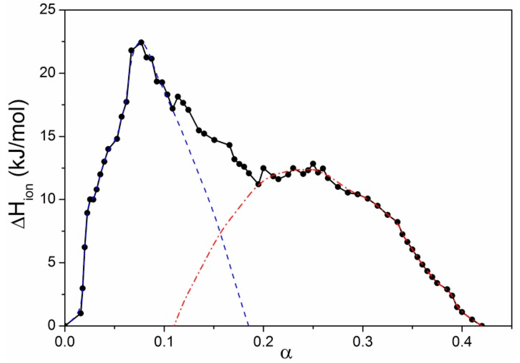 The data in Table 2 and Table 3 show that ΔHtr values are around five times higher for iPMA than for aPMA. This difference is attributed to the already discussed intermolecular association and precipitation of iPMA chains from solution. In the case of potentiometric curves, the contribution of these events could be evaluated with suitable extrapolation procedures. Also in the ΔHion case, a careful inspection of the calorimetric data suggests that the endothermic peak in the iPMA case may be a superposition of (at least) two peaks. This is probably the most obvious in the curve that applies to CsCl at 25 °C (Figure 4a) or to NaCl at 45 °C (Figure 4b). In order to separate the enthalpy of the cooperative conformational transition, ΔHconf, from the ΔHtr value a more comprehensive titration was performed by titrating the iPMA solution in the calorimeter with smaller volume increments of 0.06 M HCl. This experiment was executed only at 25 °C in the presence of 0.01 M NaCl. The result is shown in Figure 5 and confirms that the ionization of iPMA is composed of at least two processes. Traced in the direction of protonation of COO− groups (decreasing α, this is the direction in which the experiment was carried out), these are: the conformational transition, which is indicated in the region 0.4 ≿ α ≿ 0.2 (deconvolution resulted in the red dotted line), and association and precipitation, which are restricted to α ≾ 0.30 (for deconvolution see the blue dashed line). Separate integration of the peaks showed that conformational transition and association/precipitation contribute approximately equally (ΔHconf:ΔHass ≈ 1:1) to the total ΔHtr value. Taking into account the experimental uncertainty of the technique (calorimetry), similar ratios between ΔHconf and ΔHass were also obtained for other cases based on the data in Figure 4. For deconvolution of the calorimetric plots in 0.01 M LiCl and CsCl at 25 °C and in 0.01 M NaCl at 45 °C, see Figure S5 (Supplementary Materials). We thus conclude that, within the precision of the calorimetric data, the contribution of ΔHconf and ΔHass to the total ΔHtr value is approximately equal in all cases. Thus, ΔHconf due to the conformational transition alone is still around 2.7–3.4 times higher for iPMA than for aPMA. The 1:1 splitting of ΔHtr to the ΔHconf and ΔHass terms for iPMA also suggests that both the temperature dependence and the dependence on ions of ΔHconf alone remains the same as that of ΔHtr.