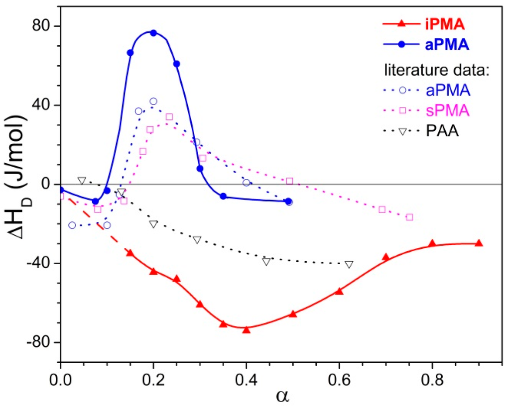 Heat effects accompanying the dilution of iPMA and aPMA solutions in water by half (from 0.065 to 0.0325 M) are plotted in Figure 6 in dependence on α. The ΔHD data for iPMA are limited to α ≳ 0.15 due to solubility/precipitation problems (see Materials and Methods). Nevertheless, the behavior is clearly different for both stereoisomers: ΔHD values are negative for iPMA and (mostly) positive for aPMA, in agreement with the literature data. Crescenzi et al. [] have measured the dilution enthalpies for the atactic and syndiotactic PMA(aPMA and sPMA, respectively) and also for PAA with a flow calorimeter (in contrast to the batch type used in our case). Those values are also plotted in Figure 6. It can be seen that they are mostly lower than ours, with the maximum appearing in approximately the same range of α values.