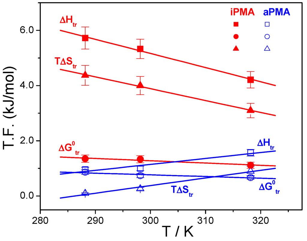 Our purpose in this contribution is to explore the molecular reasons for these well manifested differences between iPMA and aPMA by using the classical thermodynamic approach. We perform potentiometric and calorimetric measurements to determine the standard free energy, ΔGtrӨ, and enthalpy, ΔHtr, changes and therefrom the entropy, ΔStr, change associated with the transition of the chain from the uncharged to the (completely) charged state. These measurements are performed in the presence of different alkali chlorides, XCl (X = Li, Na, Cs). In addition, measurements are carried out at different temperatures (15, 25, 45 °C) in order to evaluate also the heat capacity change, (Δcp)tr, of the transition. Thermal properties, in particular the sign of (Δcp)tr, are namely the fingerprint of the hydrophobic effect [,,,], which drives many complex processes in chemistry and biology.