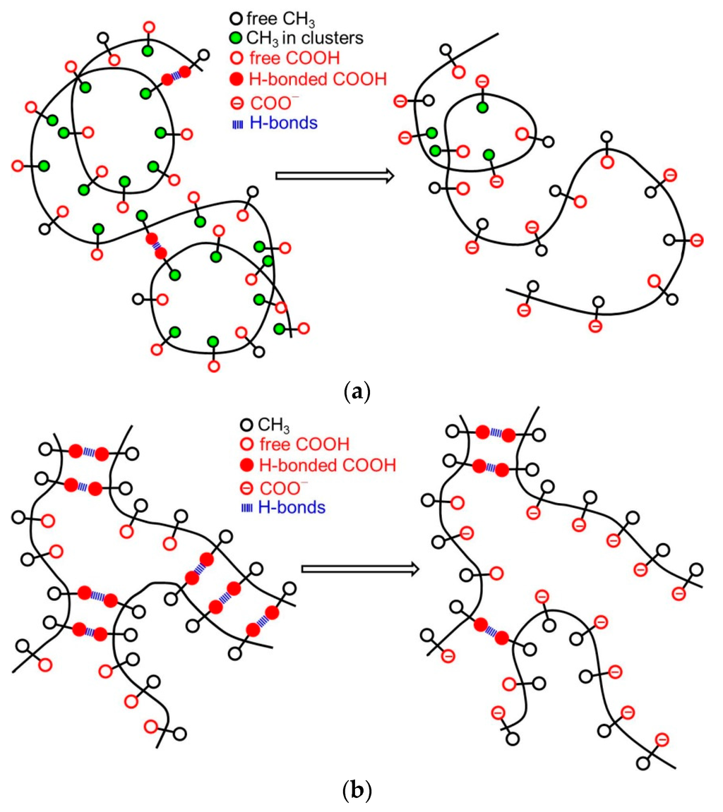 - Joyce, D.E.; Kuruscev, T. Hydrogen ion equlibria in poly(methacrylic acid) and poly(ethacrylic acid) solutions. Polymer 1981, 22, 415–417. [Google Scholar] [CrossRef]