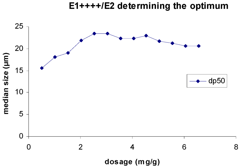 When adding the linear polymer after flocs break-up, and in order to evaluate the most suitable range of concentration for detailed testing, a preliminary test was conducted. In this test, the linear polymer was continuously added, after flocs breakage, and the value of the median flocs size, thirty seconds after polymer addition, was registered. This procedure went on till a maximum on the curve of dp50 versus the linear polymer concentration was reached. Figure 1 presents one of these curves, for the re-flocculation of the branched E1++++ with the linear polymer E2. In fact, when the linear polymer is in excess the re-flocculated flocs size stops increasing. From this curve we have identified the optimal range of E2 concentration (which maximizes re-flocculation) to lie between 2 and 4 mg polymer/g PCC. This procedure was adopted for all the polymer mixtures tested and Table 2 summarizes the range of concentrations tested for each pair branched/linear polymer. In the following tests the linear PEL was added at once, after flocs break-up, for the previously identified optimal range of concentrations.