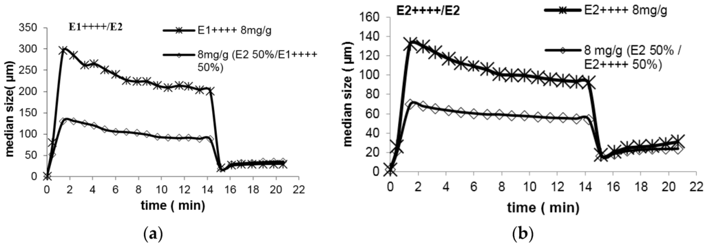 Figure 2 shows two examples of results achieved with the first strategy (simultaneous addition of the branched and the linear polymers), for a relative ratio of 50% (weight) of each polymer, for the pairs E1++++/E2 and E2++++/E2. As can be observed from this figure, re-flocculation did not improve when the dual system is added at once at the beginning of the flocculation process, if compared with the situation where only the branched polymer is used. This conclusion is common to all the pairs of branched/linear polymers tested in this way, and for all the proportions considered (75/25, 50/50 and 25/75 ratios of branched to linear polymer), independently of the type of the linear polymer added. It is also apparent from Figure 2 that, if the molecular weight of the branched PEL is higher (Figure 2a), larger flocs are obtained, as expected.
