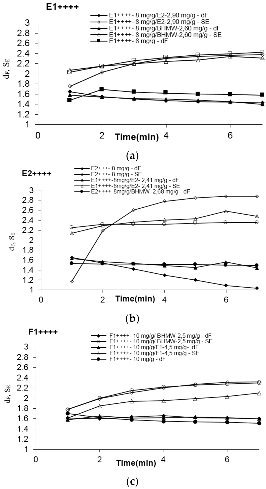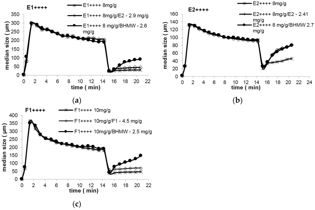 Re-flocculation with addition of linear polymer after flocs break-up: (a) E1++++/E2 and E1++++/BHMW; (b) E2++++/E2 and E2++++/BHMW; (c) F1++++/F1and F1++++/BHMW.
