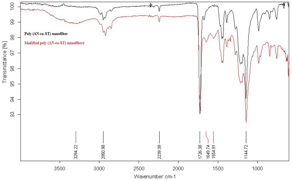 The FTIR spectrums of the two fabricated nanofibers before and after the chemical modification process were compared in Figure 2. It was indicated that the spectrum of the non-chemically modified poly(AN-co-ST) nanofibers attains main characteristic peaks at 2950 and 2239 cm−1 which may be due to the stretching vibration of methylene (–CH2–) and nitrile groups (–CN–), respectively. However, the chemically modified nanofibers have the characteristic peak of the carbonyl functional group at around 3294 cm−1 due to the CO stretching vibration which confirmed the conversion of the –CN– groups into –COOH as a result of the chemical modification process.