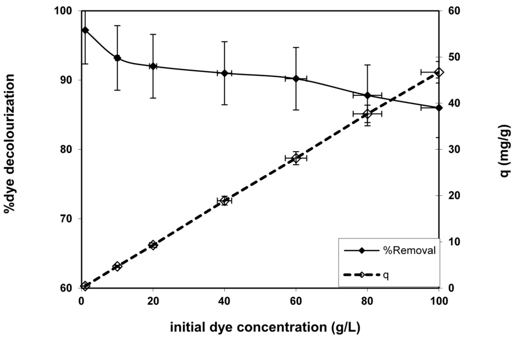 Effect of initial dye concentration on dye removal capacity and percentage decolorization onto the chemically modified nanofiber. (Volume of dye solution = 50 mL, agitation speed = 400 rpm, dosage of nanofiber = 0.1 g, pH = 6.2 and temperature = 25 °C).