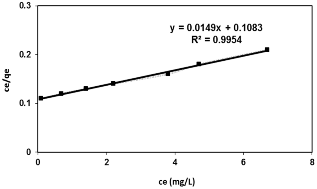 where qe is the amount adsorbed onto the nanofibers (mg/g), Ce is the equilibrium concentration of dye ions (mg/L), qm is the constant that represents the maximum adsorption capacity (mg/g) and K is the Langmuir constant related to adsorption energy (L/mg). The linear plot of Ce/qe vs. Ce was investigated in Figure 5. This figure indicates that the Langmuir equation fitted well the experimental dye sorption data onto the fabricated nanofibers with an extremely high value of the correlation coefficient (R2 > 0.99). Accordingly, the Langmuir model represents an accurate description of the dye sorption process.