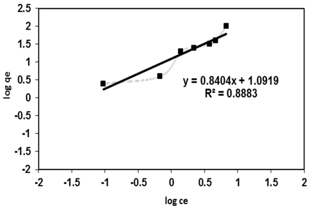 The Freundlich isotherm model proposes heterogeneous adsorptive energies on the surface of the adsorbent materials, and the linear equation may be written as [19]: