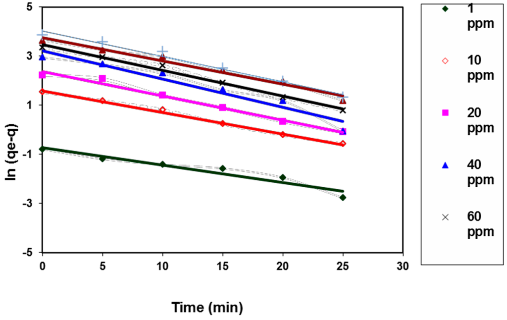 where qe is the adsorption capacity at equilibrium (mg/g), qt is the adsorption capacity at time t (min), and k1 (min−1) is the rate constant of the adsorption process. Figure 8 illustrated the plotting of ln(qe − qt) vs. time. The calculated constants from the slope and intercept of the linear plotting were tabulated in Table 2.