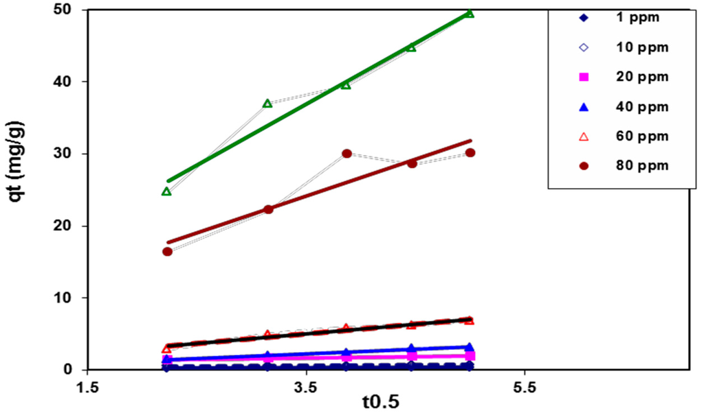 where kid represents the intra-particle diffusion rate constant that relates to the boundary layer thickness. The plotting of the intraparticle diffusion model for the adsorption of BV 14 at different initial dye concentrations was illustrated in Figure 10. It was indicated that the plot of qt vs. t1/2 for each studied dye concentration began initially as a curvature portion followed by a linear portion. This plot may be described as the bulk diffusion of dye particles being assigned to the initial curvature portion. However, the linear portion was attributed to the intraparticle diffusion. Neither the curvature portion nor the linear portion passed through the origin. These results indicate that the boundary layer resistance may control the dye sorption process. These results indicate that the intraparticle diffusion was not the only rate-limiting step and other processes may affect the dye adsorption process onto the fabricated nanofibers [25].