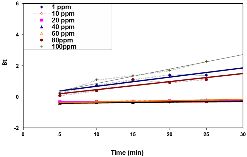where Bt represents the mathematical function of F, and F is the solute adsorbed fraction at various times t.