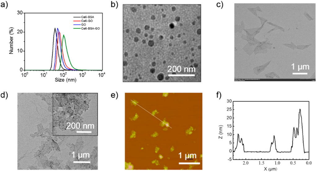 The size and morphology of the nanohybrids. (a) Size distribution of Ce6–BSA, Ce6–GO, GO, and Ce6–BSA–GO; (b) TEM image of Ce6–BSA; (c) TEM image of GO; (d) TEM images of Ce6–BSA–GO; (e) AFM image of Ce6–BSA–GO; and (f) the line profile of Ce6–BSA–GO obtained from (e).