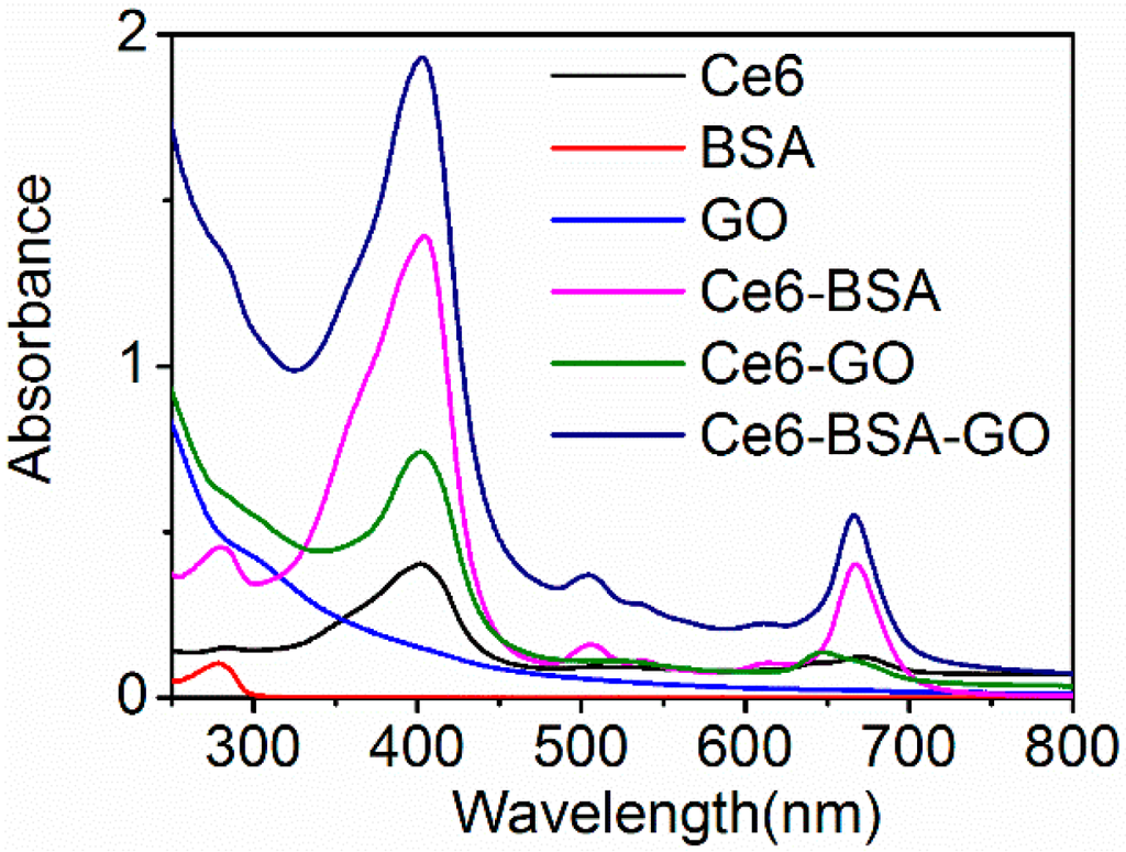 UV–Vis absorption spectra of Ce6, BSA, GO, Ce6-BSA, Ce6-GO, and Ce6–BSA–GO.