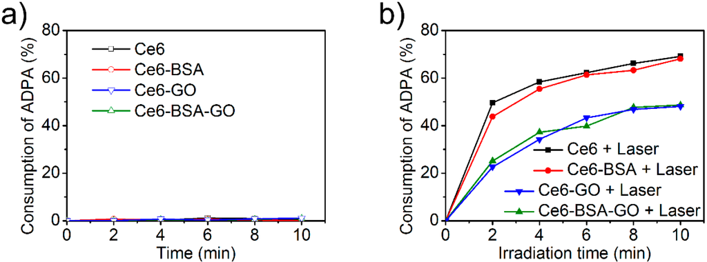 Cumulative consumption of ADPA by the ROS generated by Ce6, Ce6–BSA, Ce6–GO, and Ce6–BSA–GO in the (a) absence and (b) presence of irradiation.
