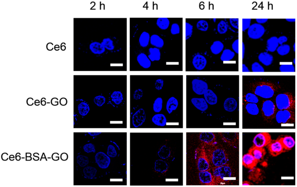 The ROS, especially singlet oxygen, have a short lifetime and a small diffusion distance in an aqueous environment. As a consequence, the efficient internalization by the cells is crucial for the nanohybrids to achieve a better therapeutic efficiency. In observation of the inhibited ROS activity of Ce6–BSA–GO, we next investigated the cellular internalization and release of Ce6–BSA–GO. CLSM images of the HeLa cells incubated with the nanohybrids for diverse times and stained with Hoechst 33342 show that Ce6–BSA–GO is efficiently internalized by cells and the release of Ce6 from Ce6–BSA–GO is efficiently triggered by cellular microenvironment (Figure 5). Only the fluorescence of Hoechst 33342 is observed in the cells incubated with Ce6 for 24 h. By contrast, the fluorescence of Ce6 is shown in the cytoplasm of the cells incubated with Ce6–GO for 24 h, indicating that the cellular internalization of Ce6–GO is more efficient than free Ce6, which is consistent with a previous report [].