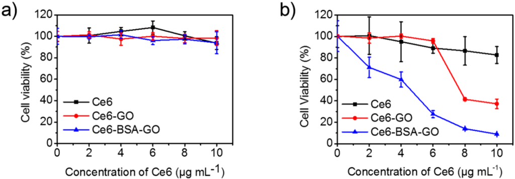 Serum albumin, the most abundant protein in blood plasma, has been approved by FDA for drug delivery based on its high biocompatibility []. The encapsulation of various hydrophobic drugs by serum albumin has been extensively studied [,]. It has been demonstrated that albumins are highly promising in encapsulation and release of photosensitizers []. As most nanoparticles are internalized by cells through a lysosome-mediated channel, the lysosomal cysteine proteases, such as cathepsin B, could induce the intracellular biodegradation of albumin [,], triggering the release of encapsulated photosensitizers. Therefore, combination of albumin with other functional materials, such as GO, by the strategy of nanoarchitectonics may be a versatile means for delivery of photoactive drugs towards enhanced PDT [,,].