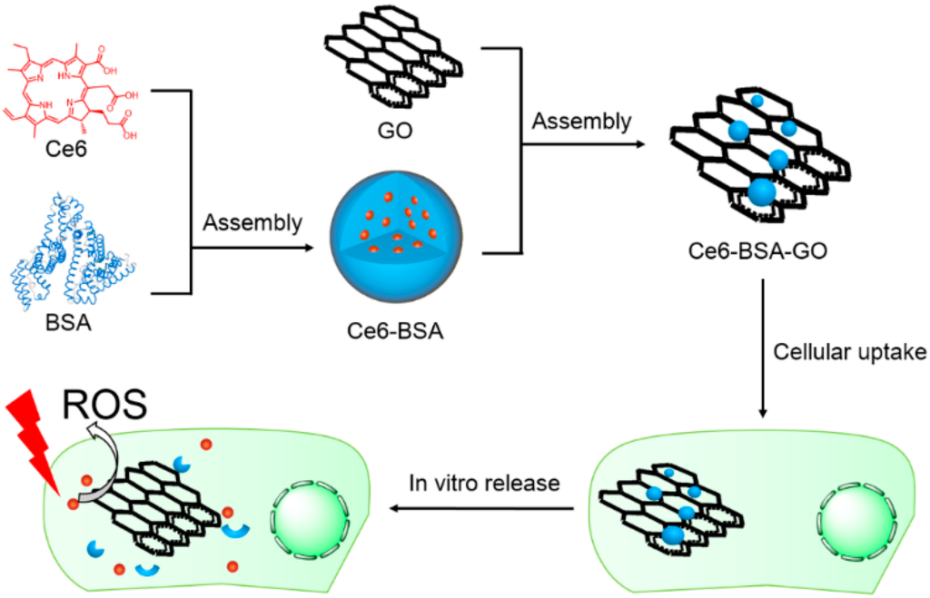 Schematic illustration of co-assembly of graphene oxide and albumin/photosensitizer nanohybrids and the enhanced in vitro photodynamic therapy.
