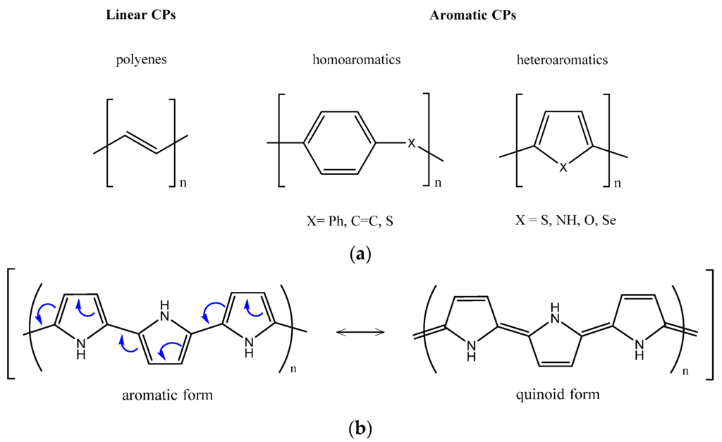 (a) Basic classification of conjugated polymers (CPs); (b) Mesomeric limiting aromatic and quinoid forms—case of PPy.